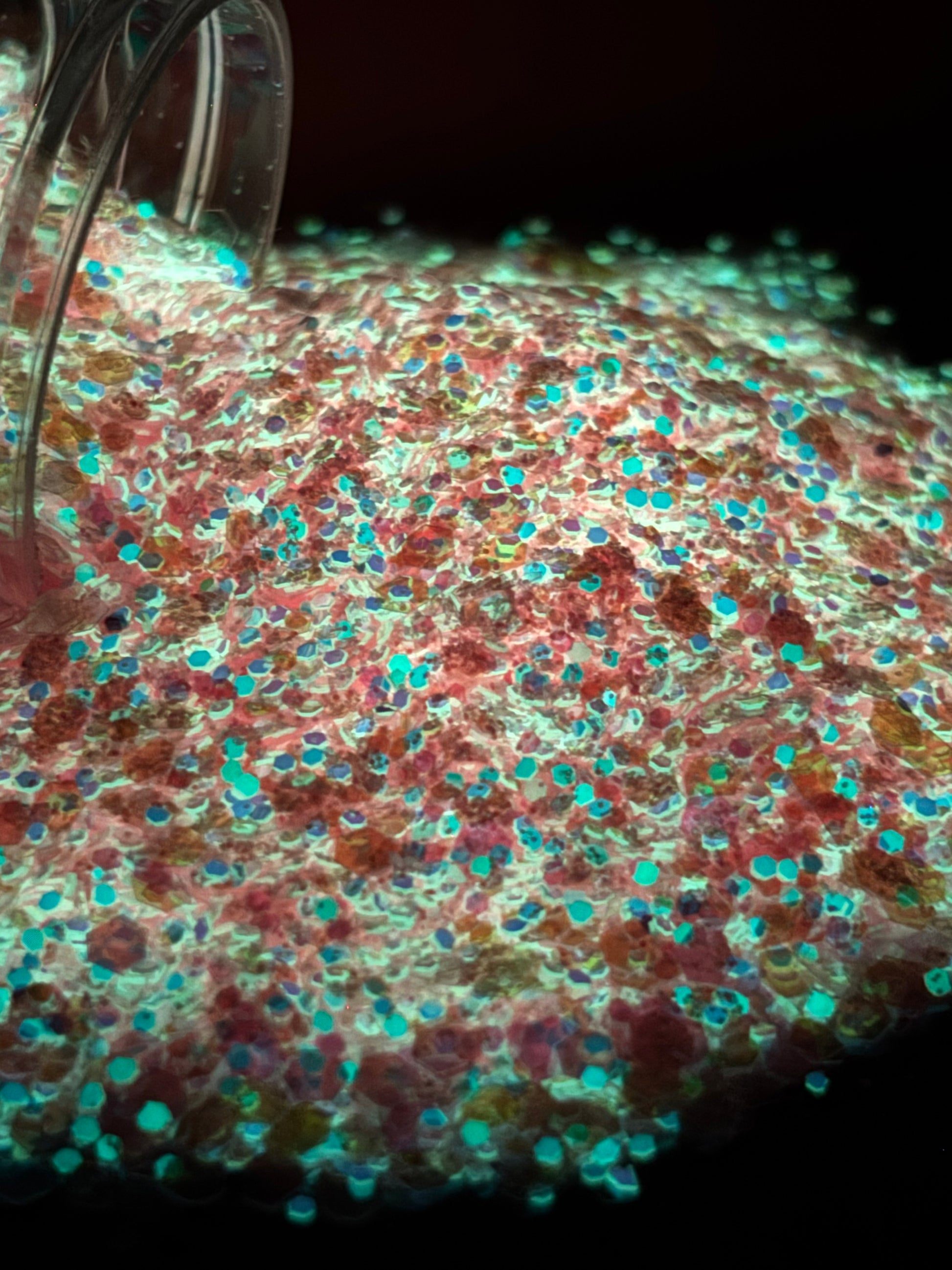 Soft, radiant, and effortlessly captivating — The Aleeshaan Glow embodies the essence of shimmer and light. In the daytime, it sparkles with delicate pink and lavender hues, reflecting subtle holographic flashes that feel dreamy and elegant. Once the lights go out, it glows with a vivid aqua-green brilliance — the perfect balance of gentle beauty and bold energy.
